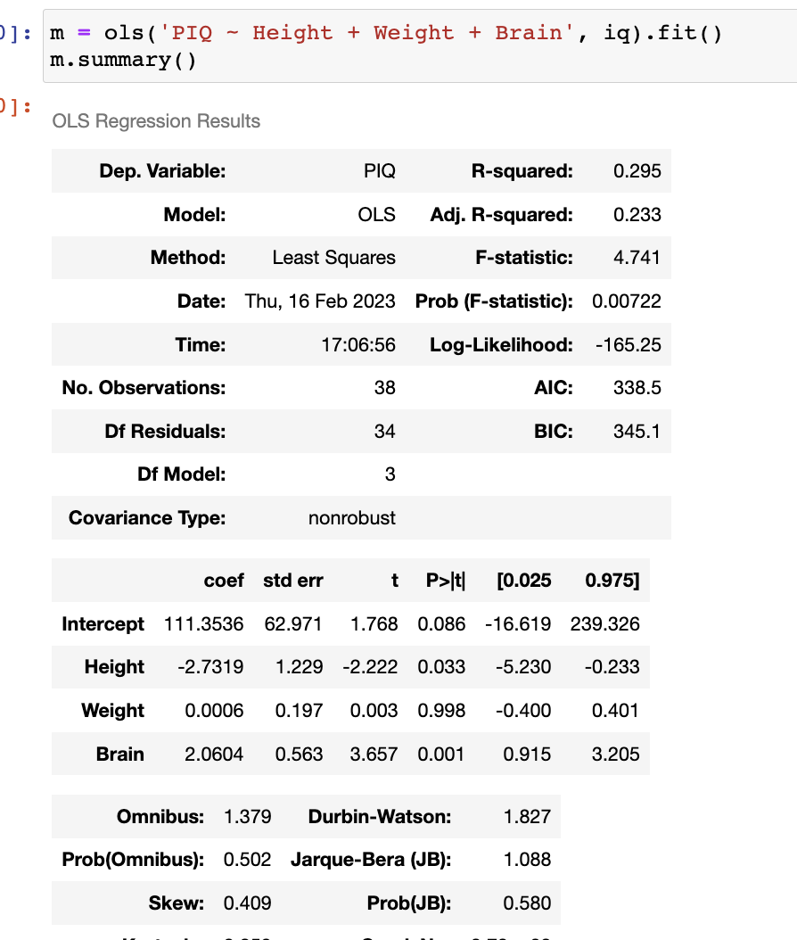 3. 모형 1에 두뇌의 크기 Brain을 추가한 모형 2로 다중회귀분석으로 분석해보세요. Height의 기울기는 p-value가 .05보다 작습니까?*