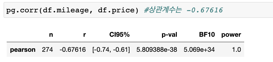 pg.corr(df.mileage, df.price, method='spearman') # 스피어만 상관계수: -0.69