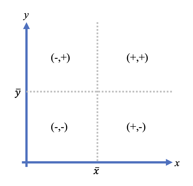 - +: 두 변수가 같은 방향으로 변화(하나 증가하면 다른 하나도 증가)