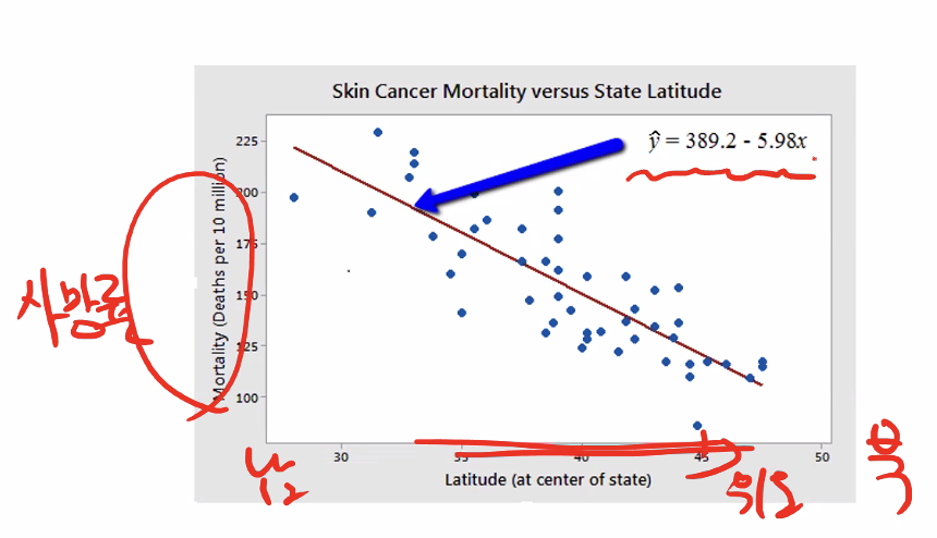 - 단순회귀분석(독립변수가 1개인 회귀분석)의 경우