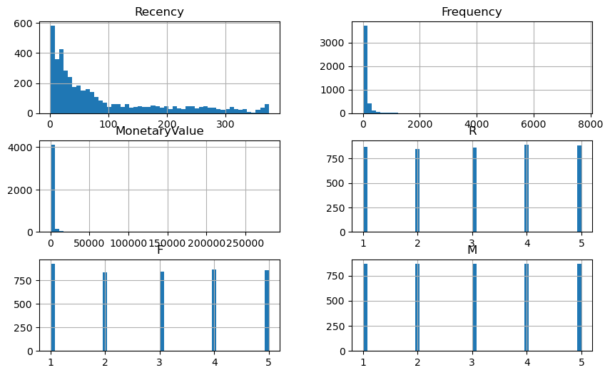 rfm.iloc[:, :-2].astype(float).hist(figsize = (10, 6), bins = 50) ;