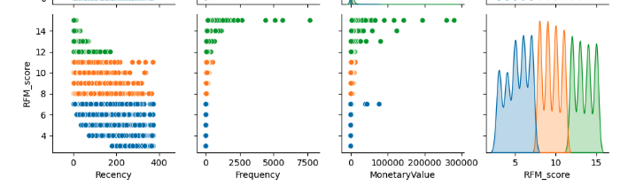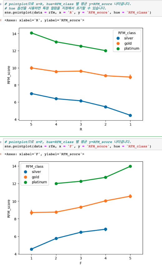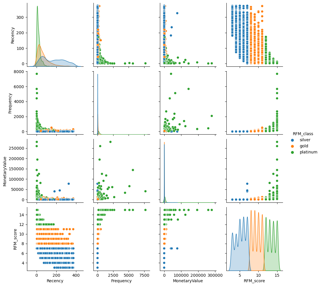 - RFM_class에 따라 RFM_score와 다른 변수들이 잘 나뉘었는지 확인할 수 있음