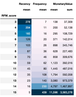 "MonetaryValue": ['mean', 'sum']}).style.format('{:,.0f}').background_gradient()
