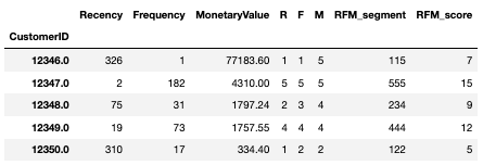 rfm["RFM_segment"] = rfm['R'].astype(str) + rfm['F'].astype(str) + rfm['M'].astype(str)