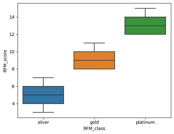 sns.boxplot(data=rfm, x="RFM_class", y="RFM_score")