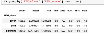 - qcut 을 통해 3단계로 "silver", "gold", "platinum" 고객군을 나누기