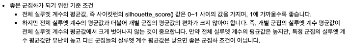- 실루엣 계수가 +1에 가까울수록 샘플이 인접한 클러스터에서 멀리 떨어져 있음을 나타냄