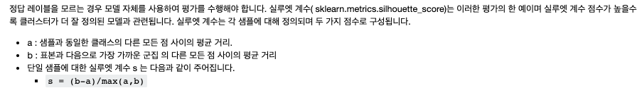 - 실루엣 계수는 데이터 세트에 대한 실측을 알 수 없는 경우에 사용되며 모델에서 계산한 클러스터의 밀도를 계산