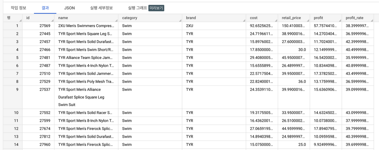 select id, name, category, brand, cost, retail_price, (retail_price - cost)as profit, (((retail_price - cost) / retail_price) * 100) as profit_rate