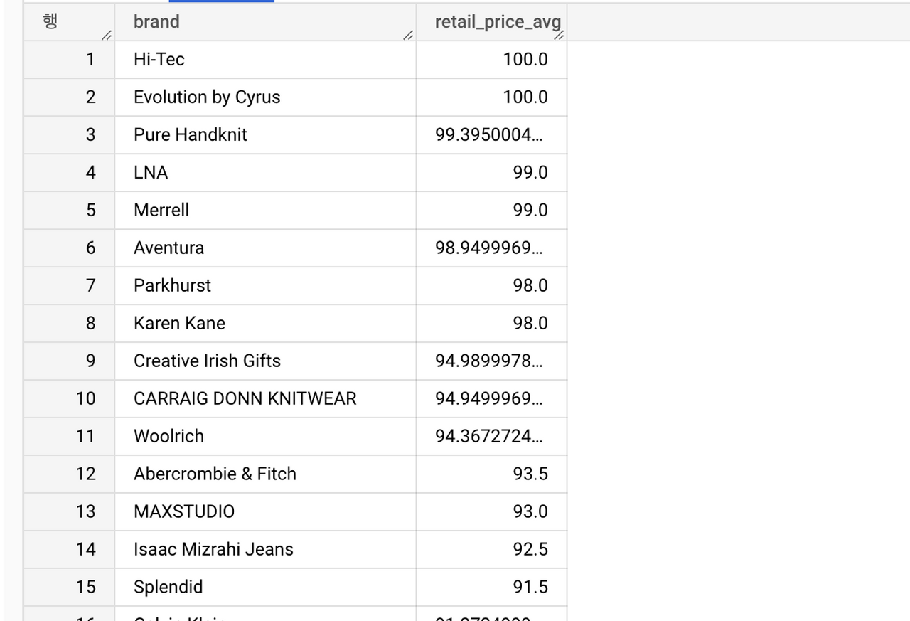 - 정렬순서 : 평균 판매가격이 낮은 순
