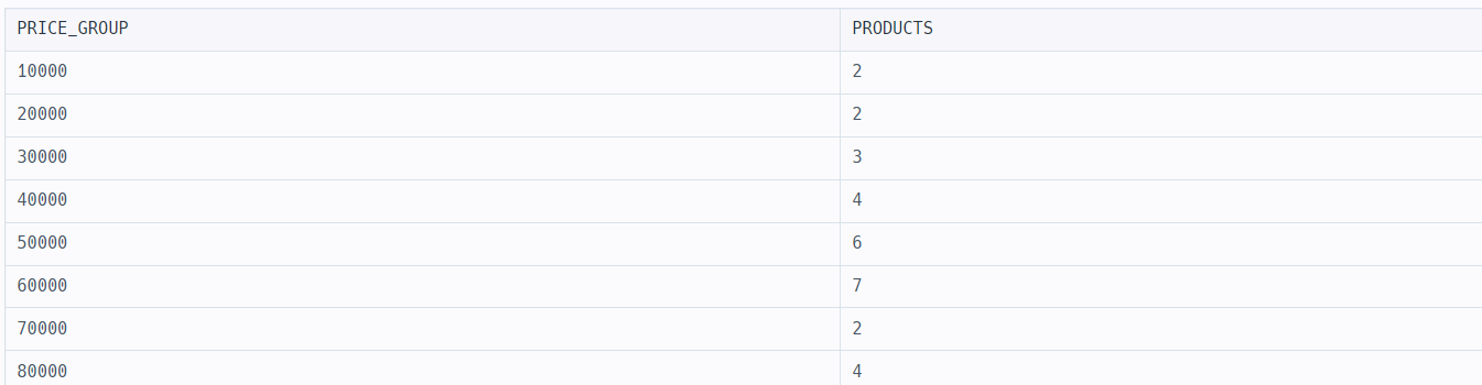SELECT LEFT(PRICE / 10000, 1) * 10000 AS PRICE_GROUP, COUNT(PRODUCT_ID) AS PRODUCTS