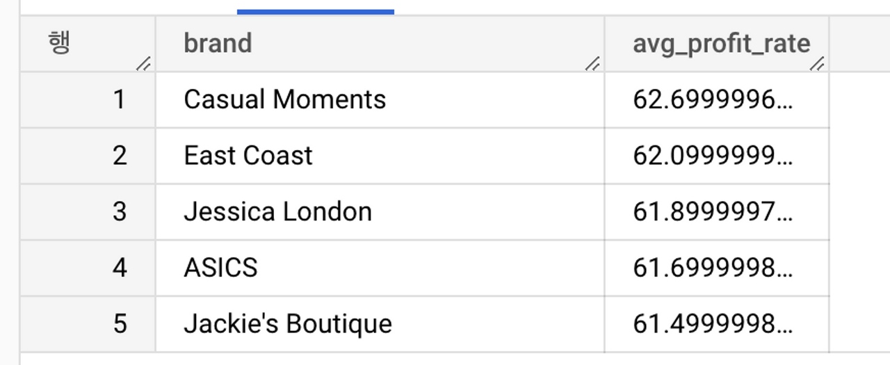 연습문제 5-5 데이터에서 평균이익율이 높은 TOP 5 브랜드와 평균이익율을 조회하세요.