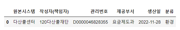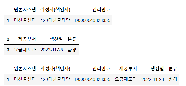 3) 분류를 수집하는 함수에 response 값을 넘겨 분류와 제공부서 등이 들어있는 데이터프레임을 반환 받습니다.