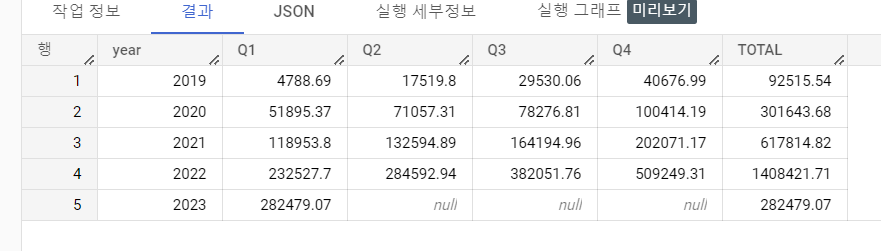 각 연도의 분기별 매출 합계
