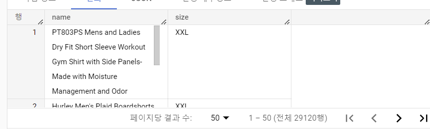 상품명 맨 끝에 ‘XS’, ‘S’, ‘M’, ‘L’, ‘XL’, ‘XXL’ 라고 적혀져 있습니다. 사이즈 컬럼에 맞는 값을 저장하고 조건에 부합하지 않는 경우에는 NULL 값을 넣어줍니다.