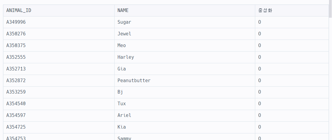 ORDER BY ANIMAL_ID, 'NAME', '중성화'