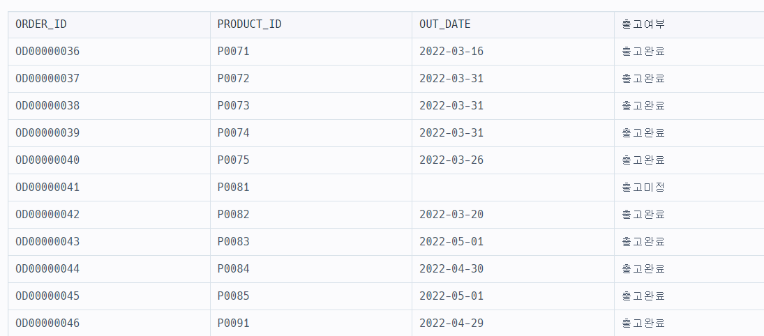 SELECT ORDER_ID, PRODUCT_ID, DATE_FORMAT(OUT_DATE, '%Y-%m-%d') AS OUT_DATE,