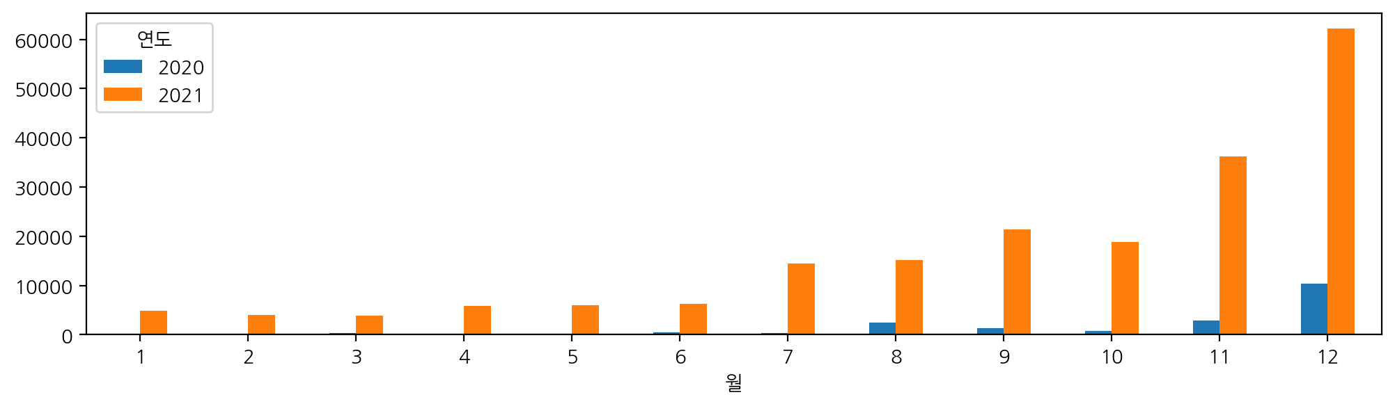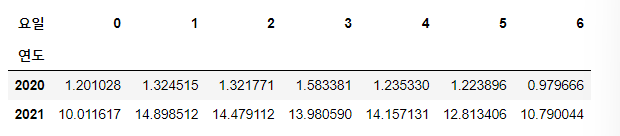 - pd.crosstab 으로 연도, 월 두 개의 변수에 대한 빈도수 구하기