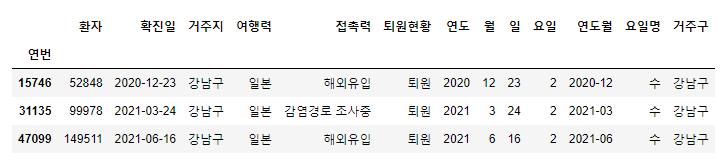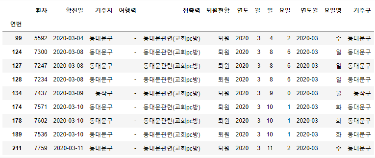 강남구에서 '일요일'에서 확진된 사람의 거주구 요일명 데이터만 찾기