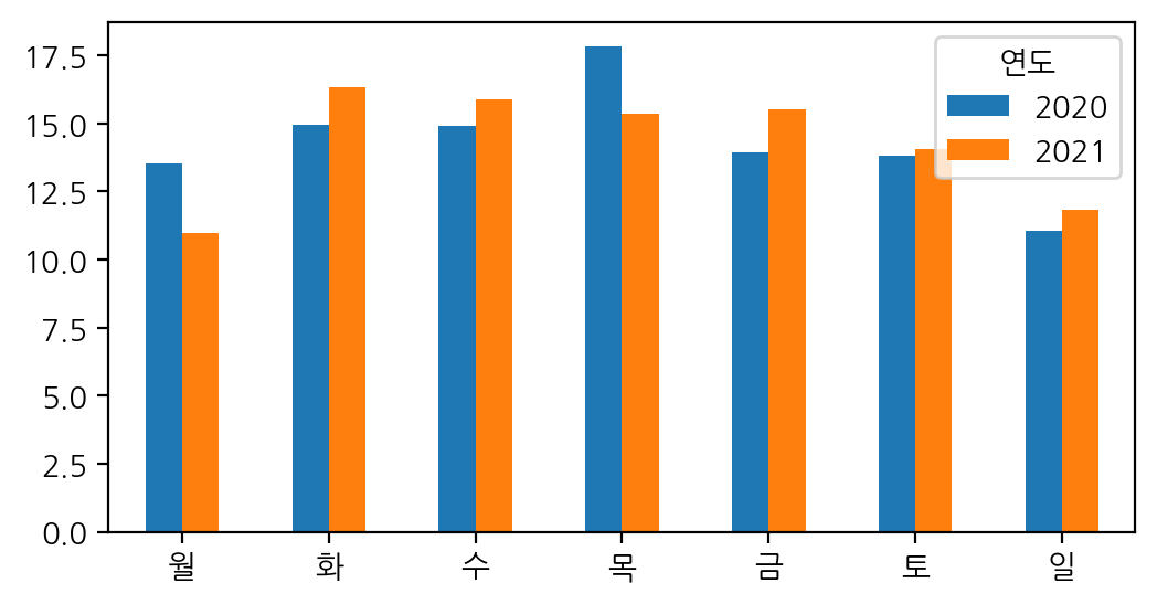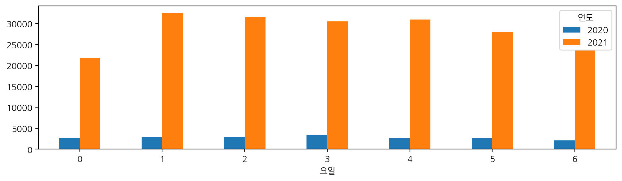 연도, 요일 두 개의 변수에 대한 빈도수 구하기