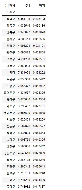 abroad = pd.crosstab(index = df['거주구'], columns = df['국내해외'], normalize = True) * 100