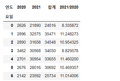 cross_1 = pd.crosstab(index=df['연도'], columns = df['요일'])