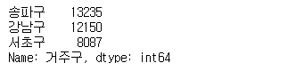 df.loc[df['거주구'].str.contains("강남구|서초구|송파구"), '거주구'].value_counts()