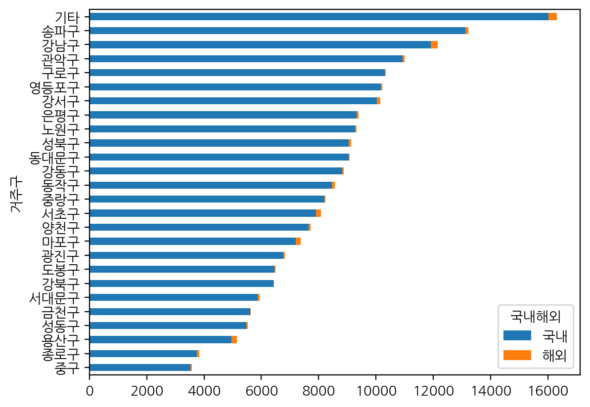 gu_oversea[['국내', '해외']].sort_values('국내').plot(kind = 'barh', stacked = True)