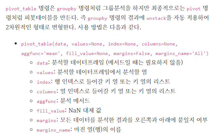 - pivot 은 형태 변환만 제공하고 / pivot_table 은 연산을 함께 제공합니다. pivot_table 은 aggfunc 등의 기능을 제공 groupby() 를 사용하기 쉽게 엑셀에서 사용하는 용어로 만들어 놓은 것이 pivot_table() 입니다.