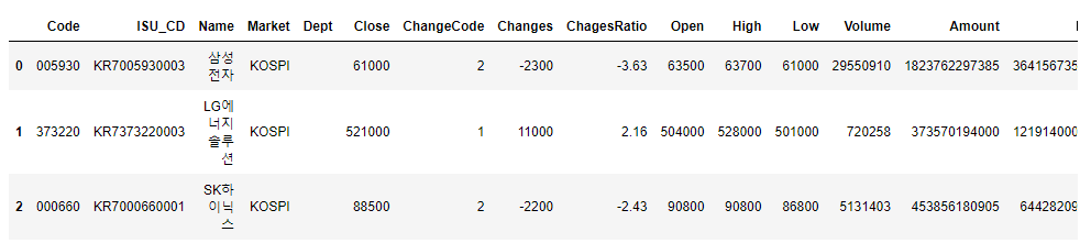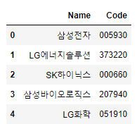 df_krx = fdr.StockListing('KRX')[['Name', 'Code']]