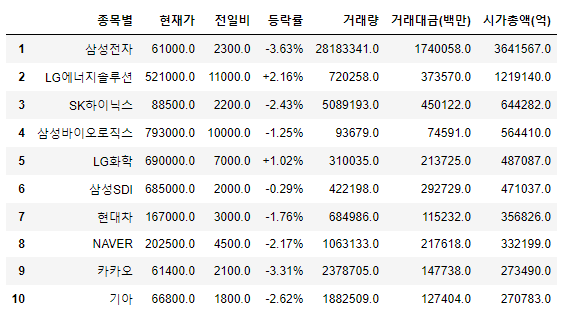 merge를 통한 시가총액 상위 10개 종목 만들기