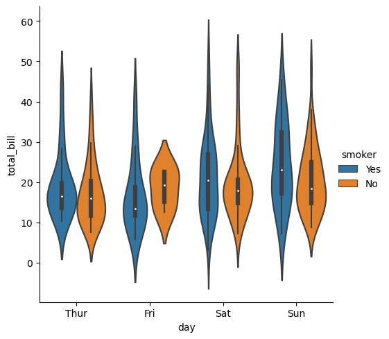 sns.catplot(data=tips, kind="violin", x="day", y="total_bill", hue="smoker")