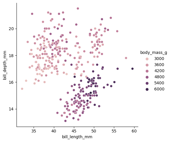 x="bill_length_mm", y="bill_depth_mm", hue="body_mass_g"