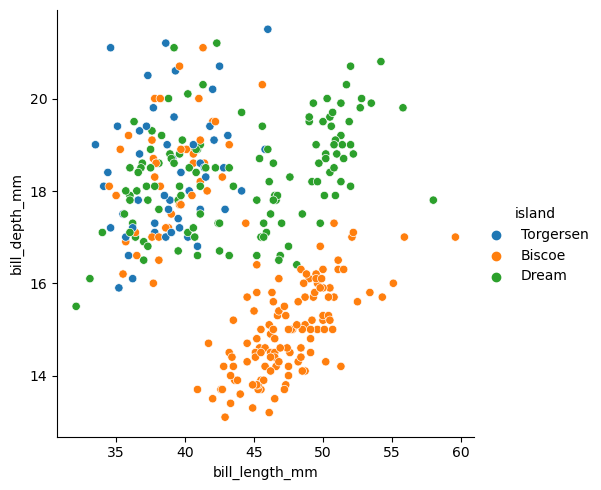 x="bill_length_mm", y="bill_depth_mm", hue="island"