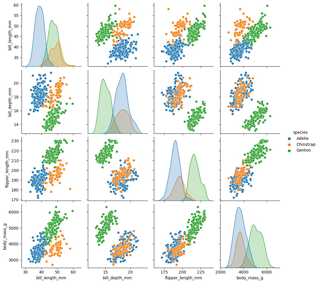 sns.pairplot(data=penguins, hue="species")
