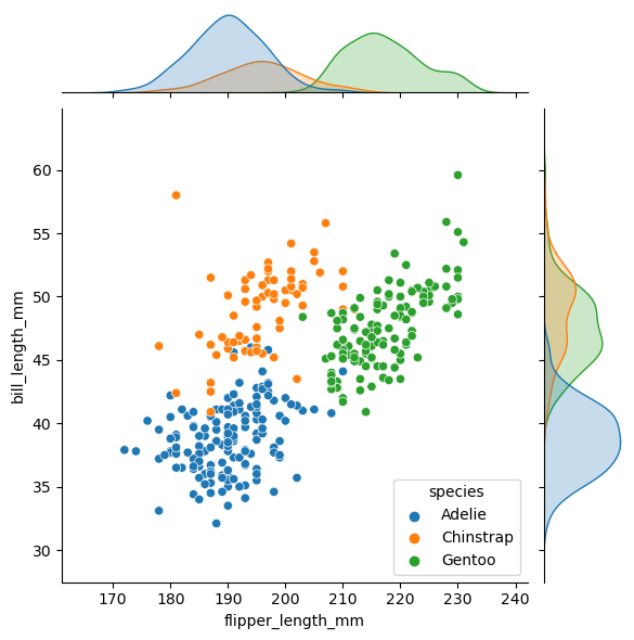 sns.jointplot(data=penguins, x="flipper_length_mm", y="bill_length_mm", hue="species")