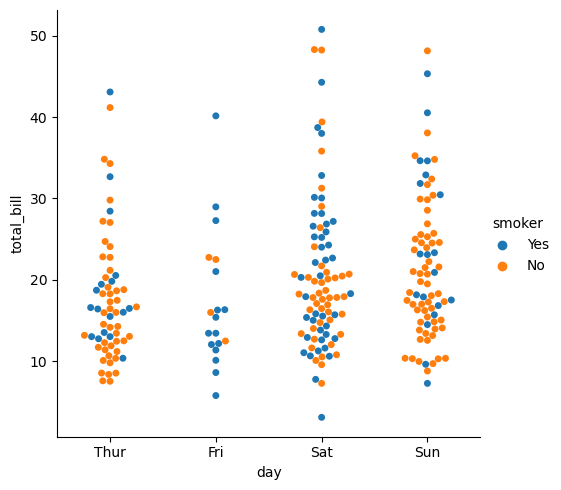 sns.catplot(data = tips, kind ='swarm', x = 'day', y ='total_bill', hue = 'smoker')
