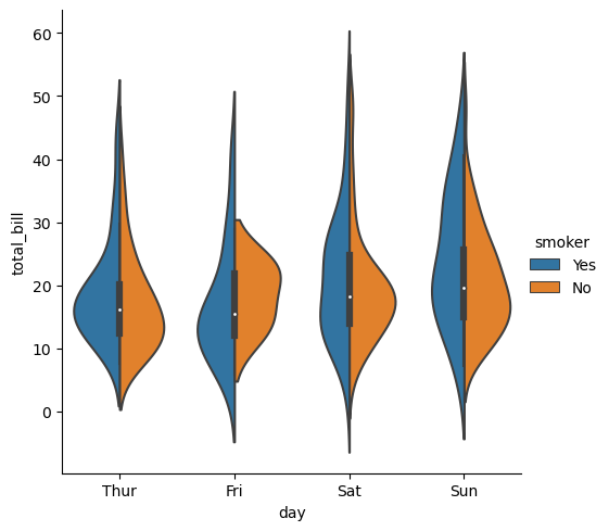 sns.catplot(data=tips, kind="violin", x="day", y="total_bill", hue="smoker", split=True)