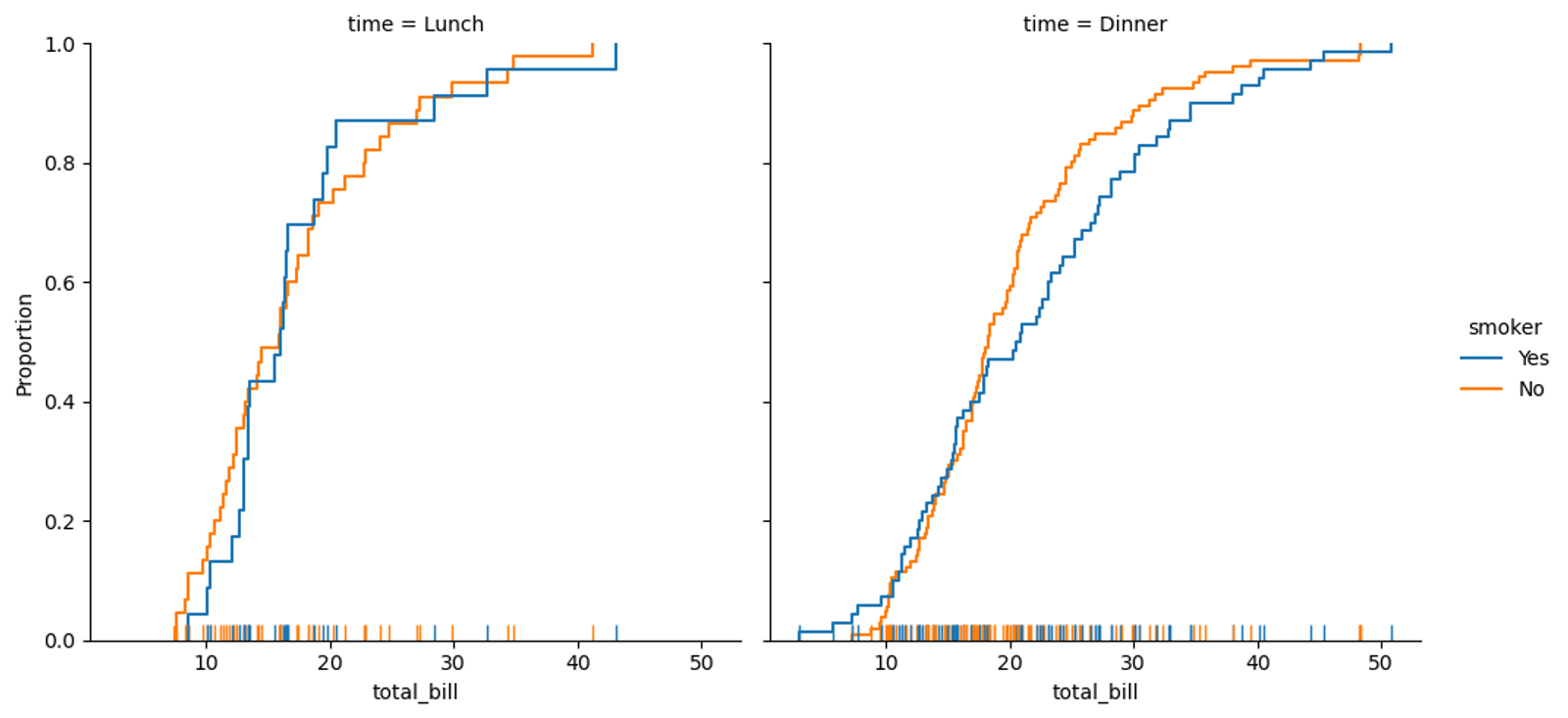 sns.displot(data=tips, kind="ecdf", x="total_bill", col="time", hue="smoker", rug=True)