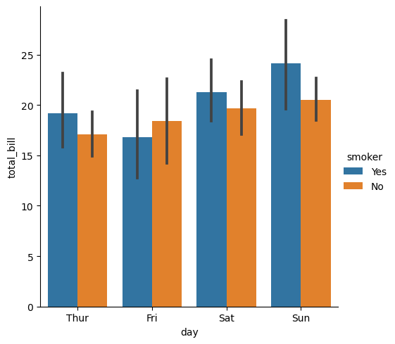 sns.catplot(data=tips, kind="bar", x="day", y="total_bill", hue="smoker")