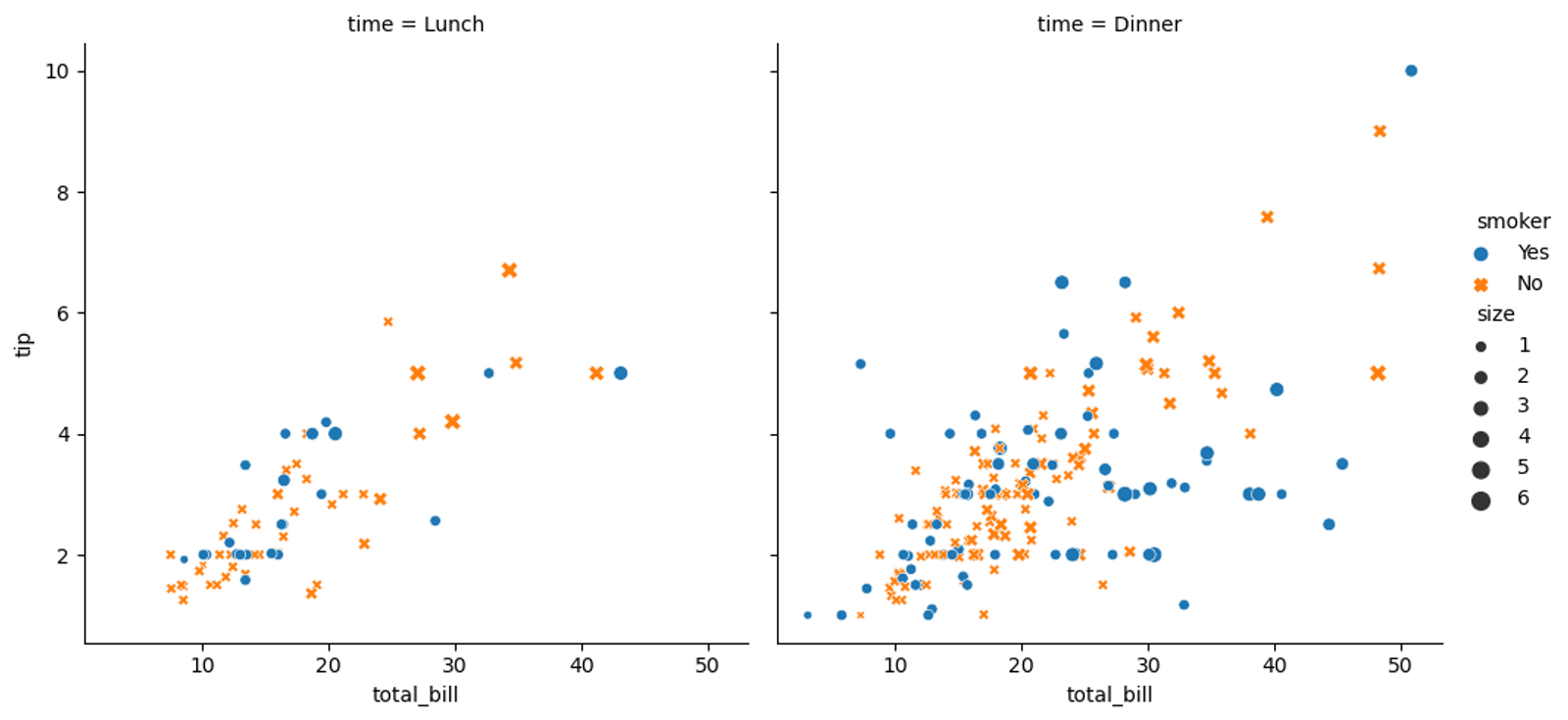 col = 'time', hue = 'smoker', style = 'smoker', size = 'size')