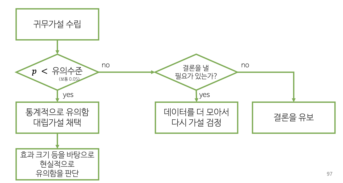 - 반증주의 철학에 기반하고 있어 일반적인 과학적 가설 검정과 다름