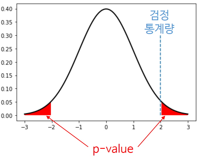 - 유의수준: 100% - 신뢰수준(신뢰수준이 95%면, 5%가 유의수준) - p-값을 계산한다
