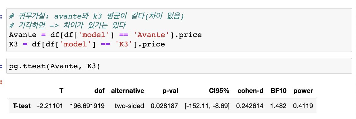 귀무가설은 모집단에서 평균차이 = 0, k3평균 = Avante 평균이라는 것