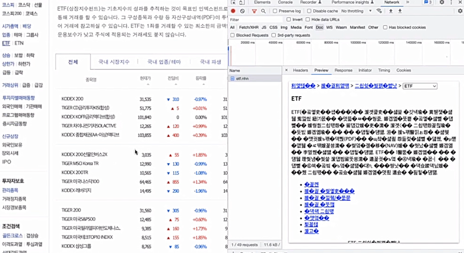 1) 수집하고자 하는 데이터가 어떤 태그에 들어있는지 확인 -> table 태그라면 pd.read_html()로 불러올 수 있고 2) pd.read_html()로 수집이 안 된다면 requests로 요청을 보냄 -> requests 요청을 보내기 위한 주소를 Network 메뉴에서 찾는다. url => preview로 봤을 때 해당 데이터가 있는지 확인 etf 는 없는 상태 -> js나 xhr 확인 ETF란? ETF(상장지수펀드)는 기초지수의 성과를 추적하는 것이 목표인 인덱스펀드로, 거래소에 상장되어 있어서 개별주식과 마찬가지로 기존의 주식계좌를 통해 거래를 할 수 있습니다. 그 구성종목과 수량 등 자산구성내역(PDF)이 투명하게 공개되어 있고, 장중에는 실시간으로 순자산가치(NAV)가 제공되어 거래에..